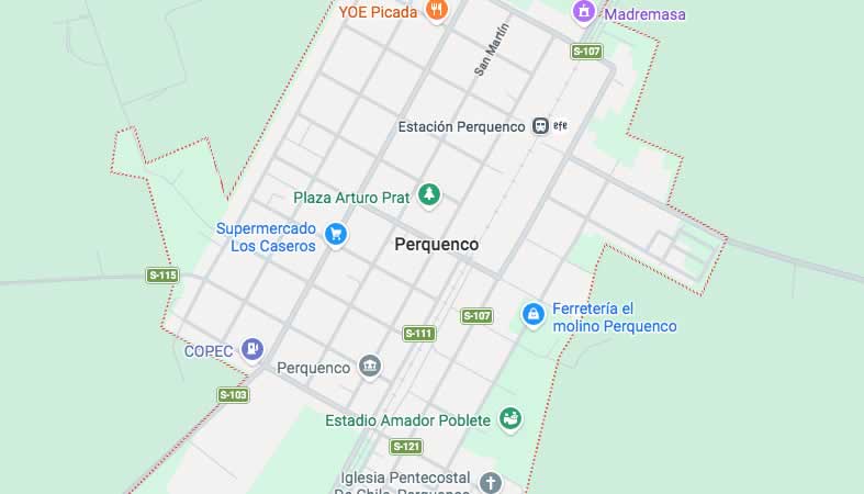 La Comuna de Perquenco, ubicada al norte de la Provincia de Cautín en la Región de La Araucanía, Chile, se asienta en una llanura que forma parte de la depresión intermedia y es atravesada por la cuenca del río Imperial, incluyendo el río Cautín y el río Quillén. Su diseño urbano, con un centro consolidado, es característico de las localidades que surgieron con el desarrollo agrícola, comercial y ferroviario a fines del siglo XIX y principios del XX. La comuna cuenta con 31 calles registradas que conforman su trazado. Entre las principales arterias y pasajes se encuentran la calle 21 de Mayo, Aníbal Pinto, Arturo Prat Chacón, Bernardo O'Higgins Riquelme, Brasil, Capitán Orella, Cornelio Saavedra, Ecuador, Eleuterio Ramírez, Esmeralda, General Urrutia, Guacolda, Ignacio Serrano, José Manuel Balmaceda, José Miguel Carrera, José Victorino Lastarria, Los Cóndores, Manuel Antonio Matta, Nicasio de Toro, Pedro Lagos, San Martín, Sargento Aldea y Variante Rehuecoyán. Además, existen pasajes como Las Orquídeas, Las Rosas, Los Jazmines y Los Lirios. El Cruce Longitudinal - Perquenco, Cruce Perquenco Ruta 5 y Cruce S-10 - Reducción Novoa son puntos clave en su conectividad vial. La distribución de sus calles refleja un crecimiento orgánico a partir de un núcleo original, adaptándose a su geografía de llanura y a la influencia de los cursos de agua cercanos, lo que ha configurado un mapa donde la identidad local se entrelaza con las rutas que conectan a sus habitantes con la región.